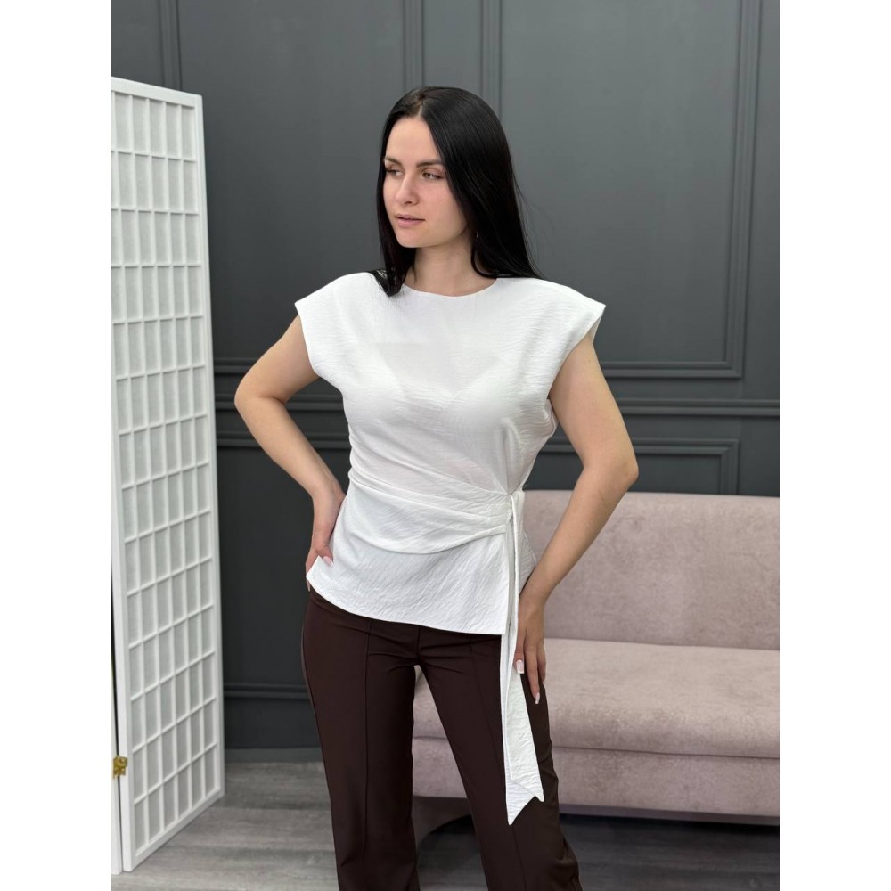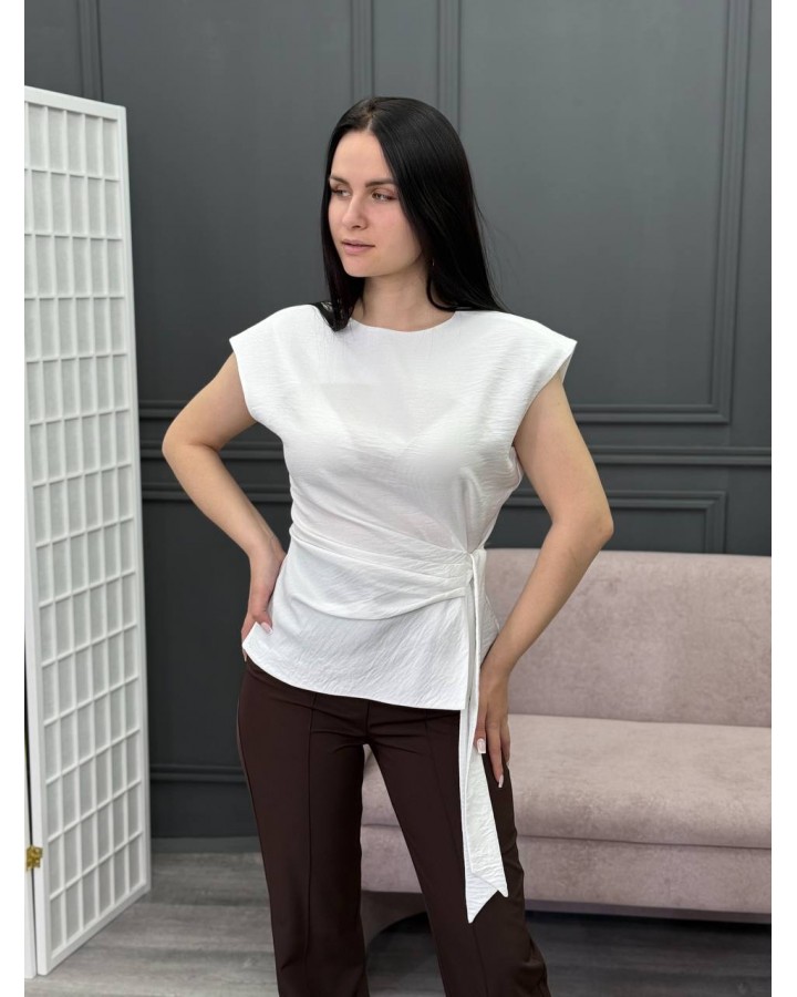 Блузка из материала жатка в пудровом цвете. Декоративные складки на талии и ленты для регулировки объема