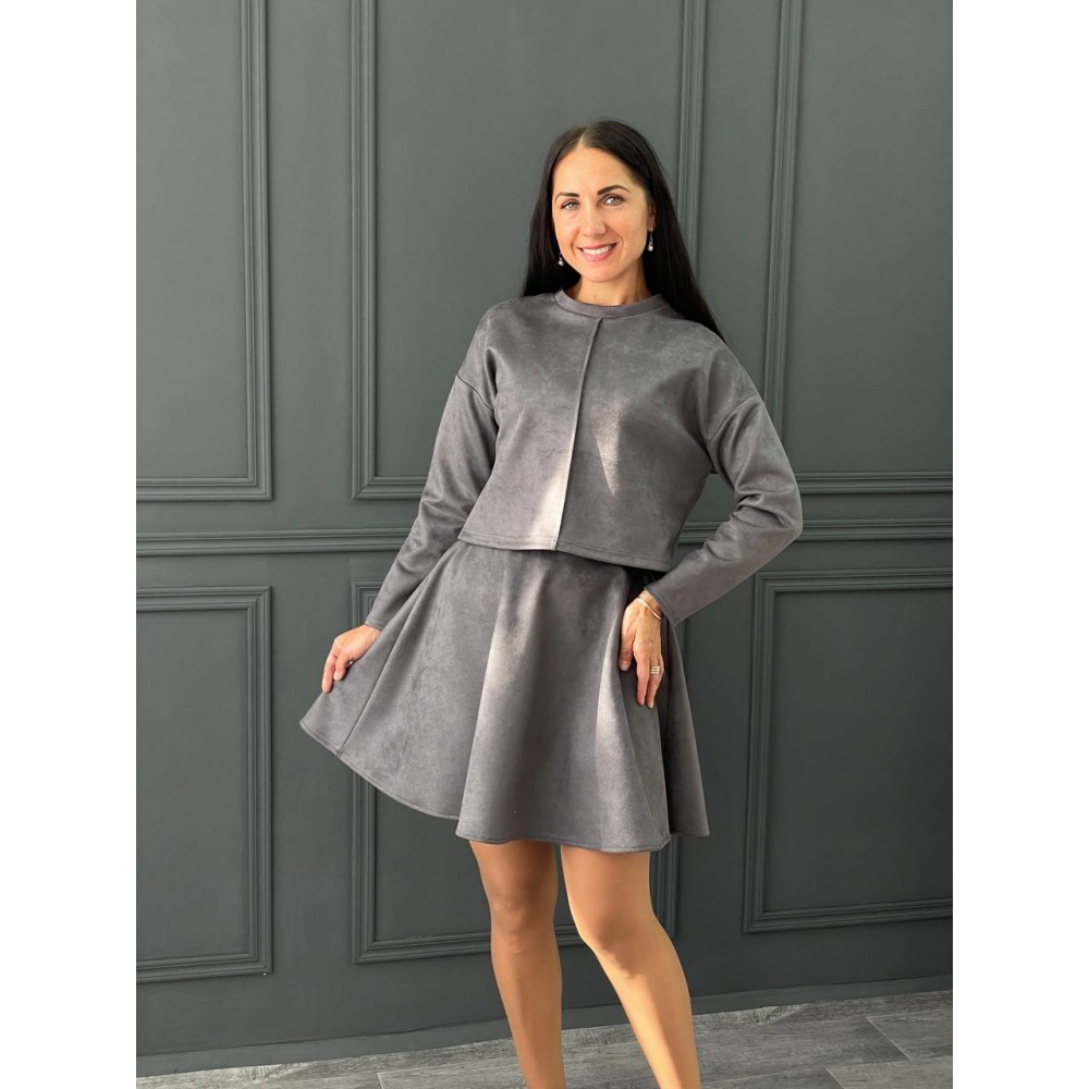Оформить заказКостюм в цвете графит из замши. Укороченный свитшот и юбка полусолнце. Юбка на резинке и потайной молнии.