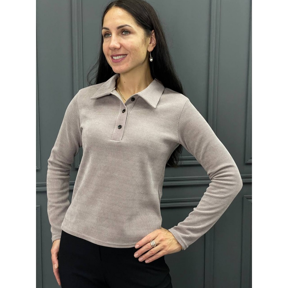 Лонг поло прилегающего силуэта. Выполнен из трикотажа в рубчик сиреневого цвете