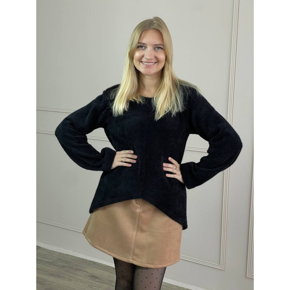 Оформить заказСвитер из трикотажа пушистик. С фигурным вырезом по переду и удлиненной спинкой. Пояс в комплекте