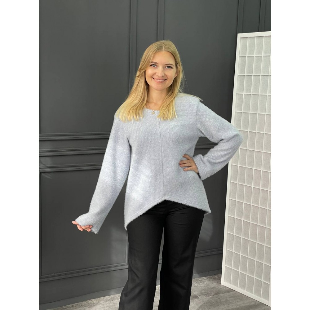 Оформить заказСвитер из трикотажа пушистик. С фигурным вырезом по переду, удлиненной спинкой. Пояс в комплекте
