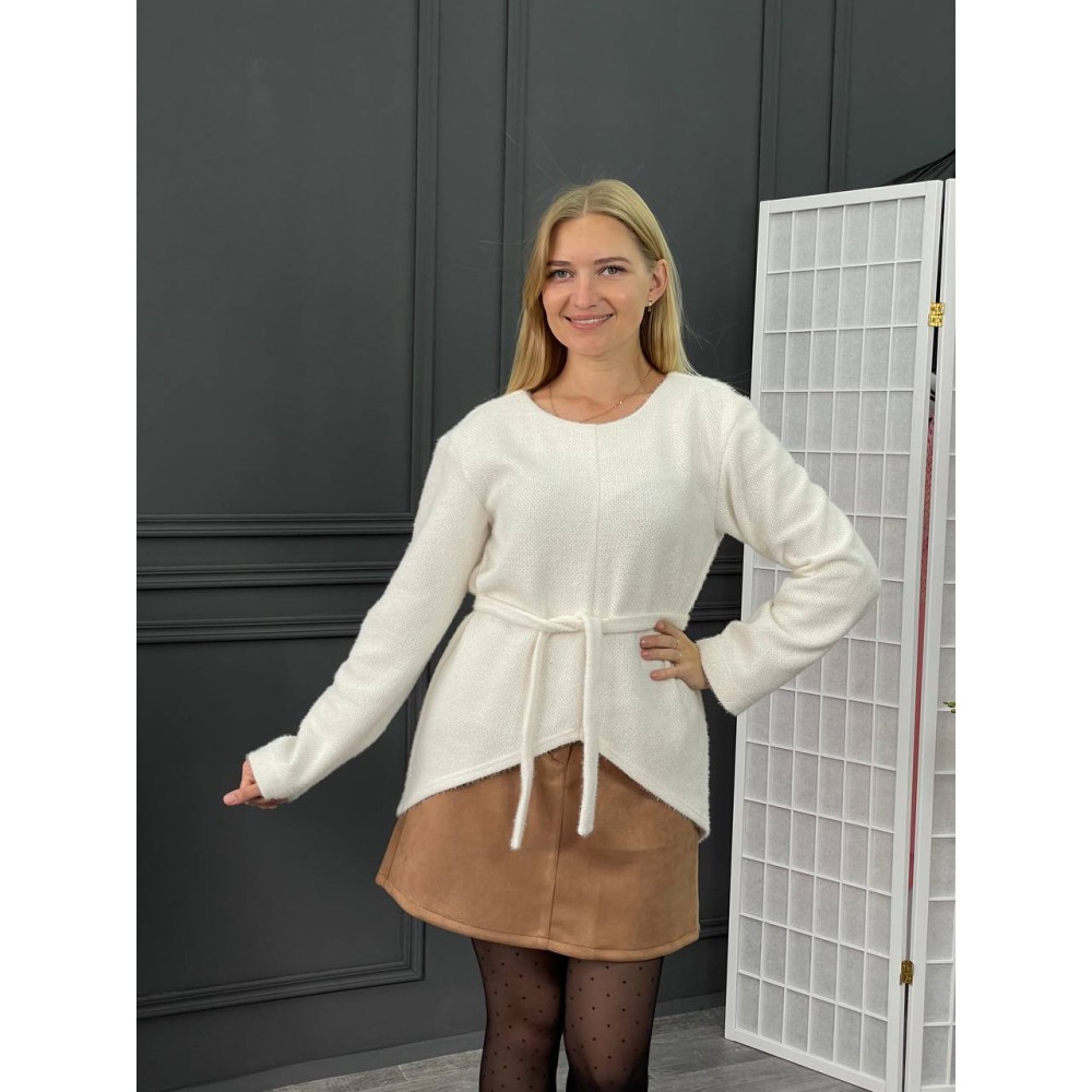 Свитер из трикотажа пушистик с фигурным вырезом по переду, удлиненная спинка. Пояс в комплекте
