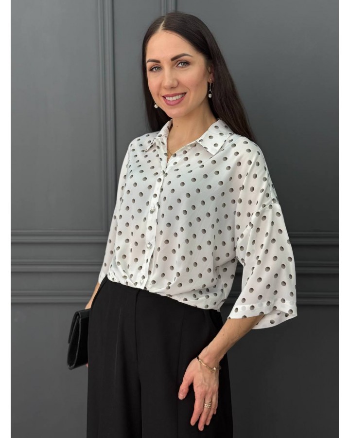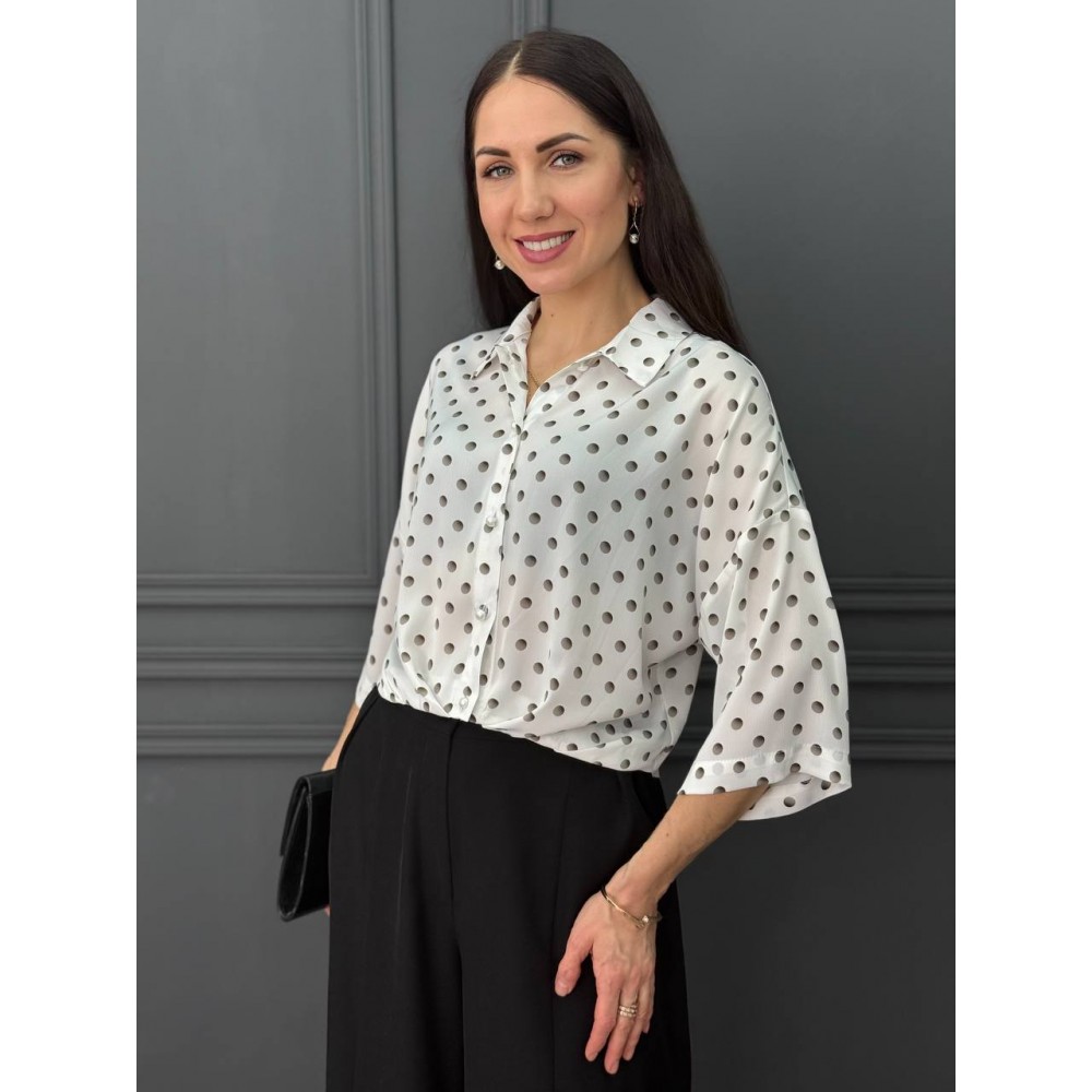 Укороченная блузка с защипами. Выполнена из плотного шифона в трендовой романтичной расцветке горох
