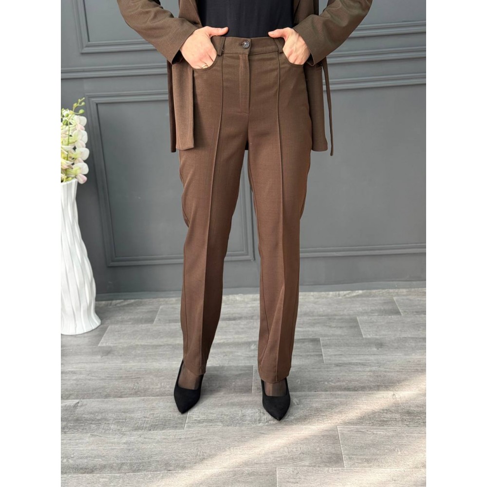 Брюки с отстроченной стрелкой в коричневом цвете. Резинка на поясе сзади. Посадка ниже талии