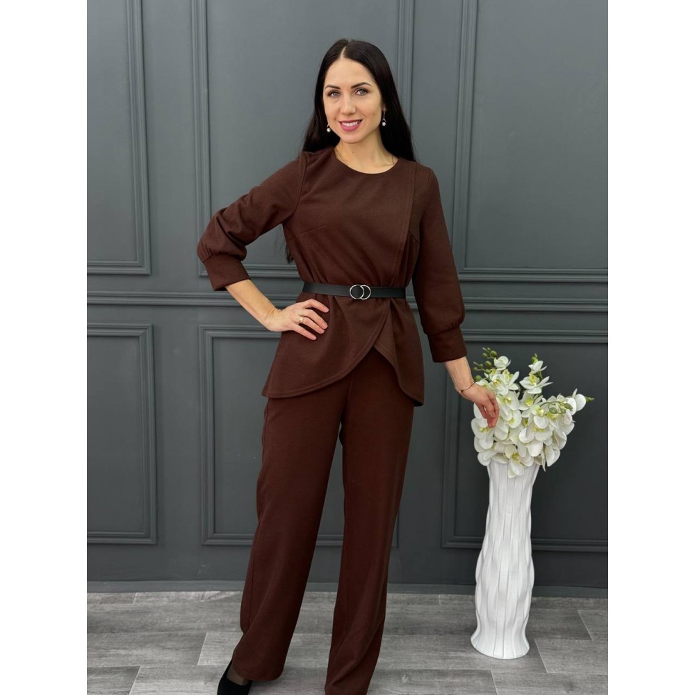 Оформить заказКостюм из вязанного трикотажа в шоколадном цвете. Классический брюки на резинки и блузка на запах
