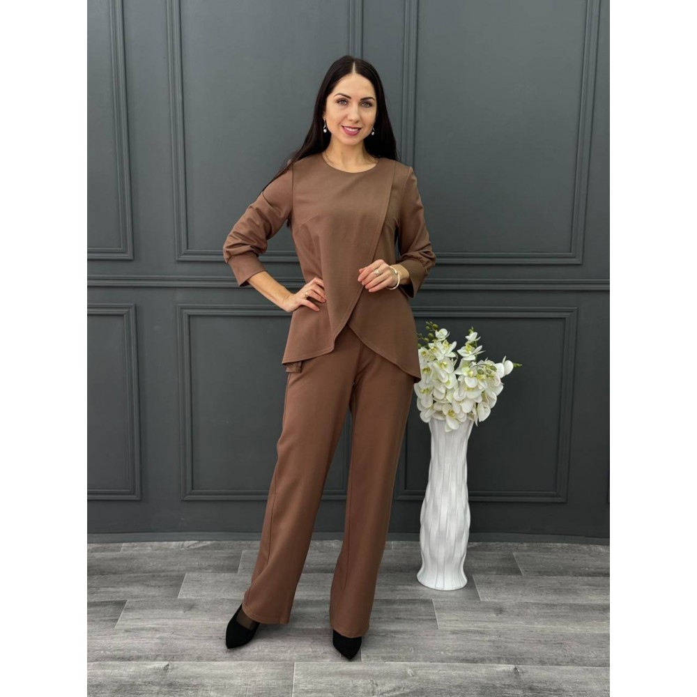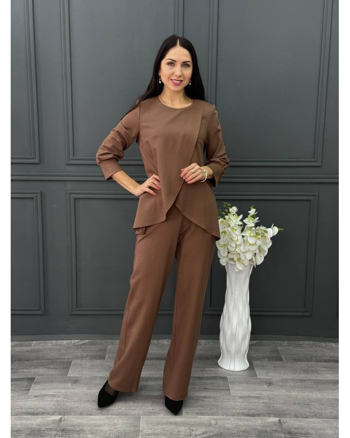 Оформить заказКостюм из трикотажа в цвете соленая карамель. Классический брюки на резинки и блузка на запах