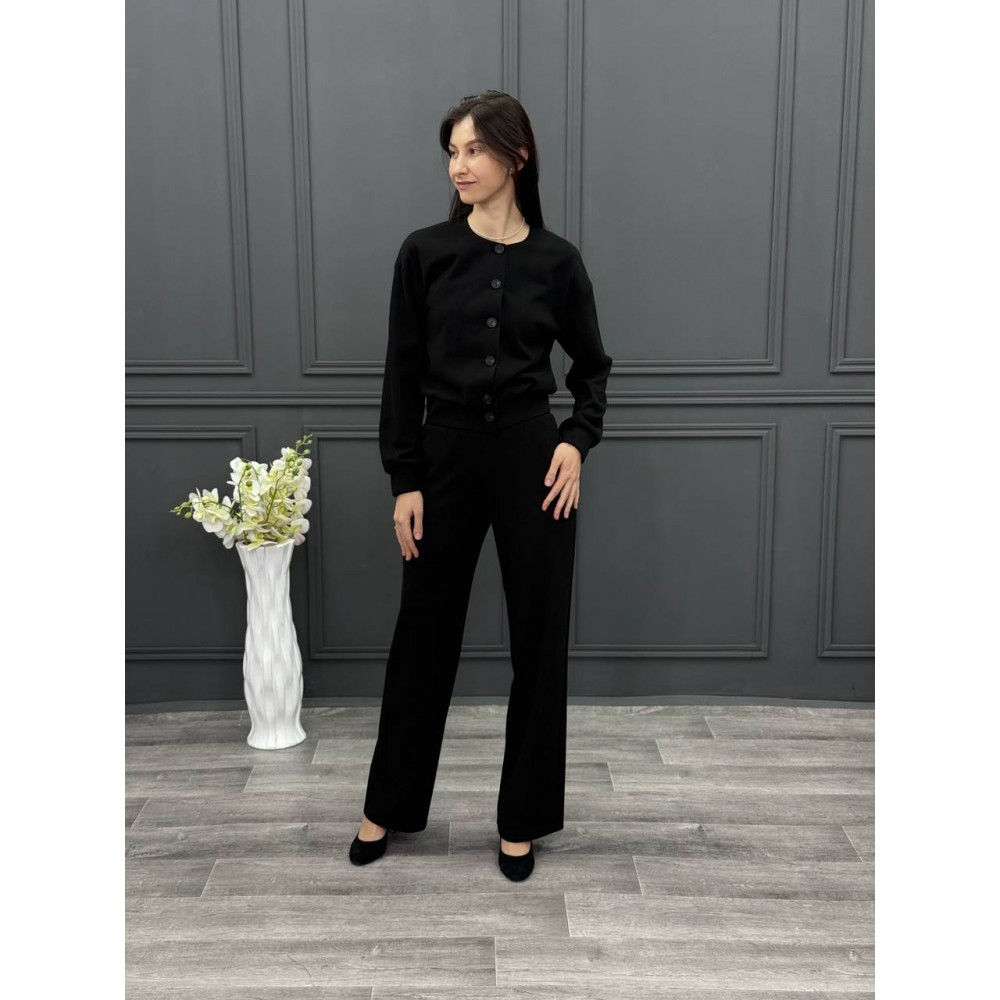 Оформить заказКостюм из вязанного трикотажа в черном цвете. Кардиган и брюки палаццо на резинке