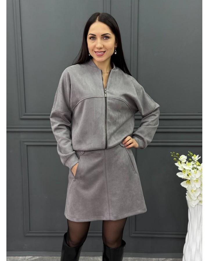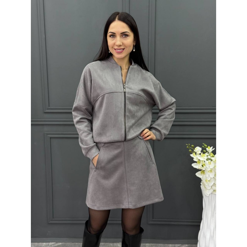 Оформить заказКостюм из замшевого трикотажа в сером цвете. Хит продаж - бомбер, теперь в комплекте с мини юбкой. Юбка а-силуэта на потайной молнии сзади
