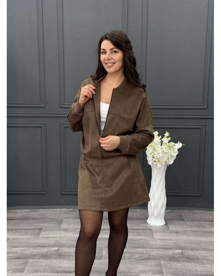 Оформить заказКостюм с юбкой из замшевого трикотажа в цвете капучино. Хит продаж - бомбер, теперь с юбкой. Юбка мини на потайной молнии сзади