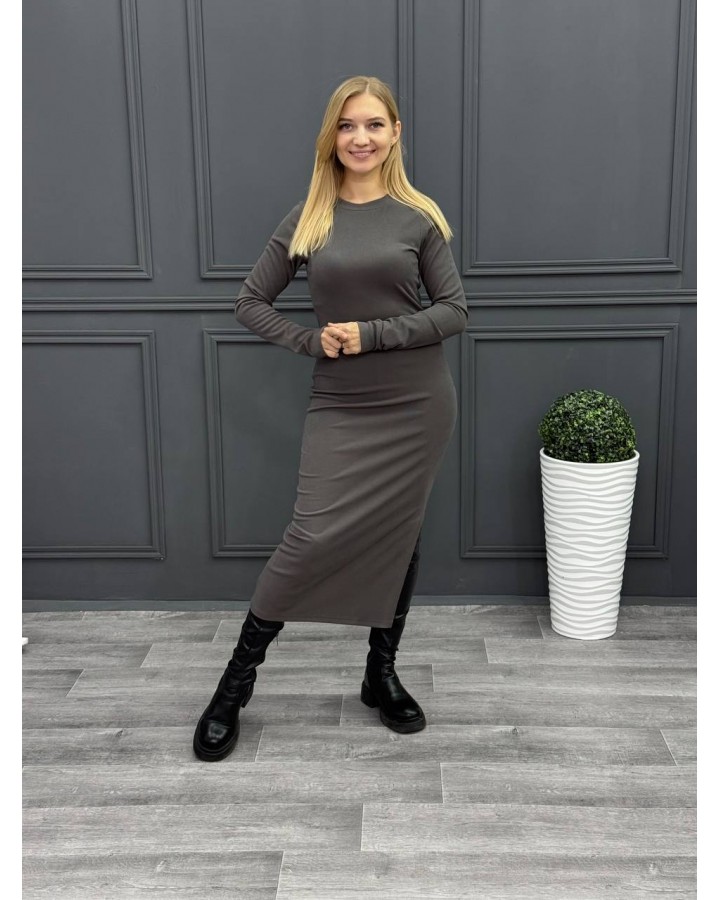 Оформить заказОблегающее платье из трикотажа в рубчик в цвете графит с разрезом. Маломерит на размер
