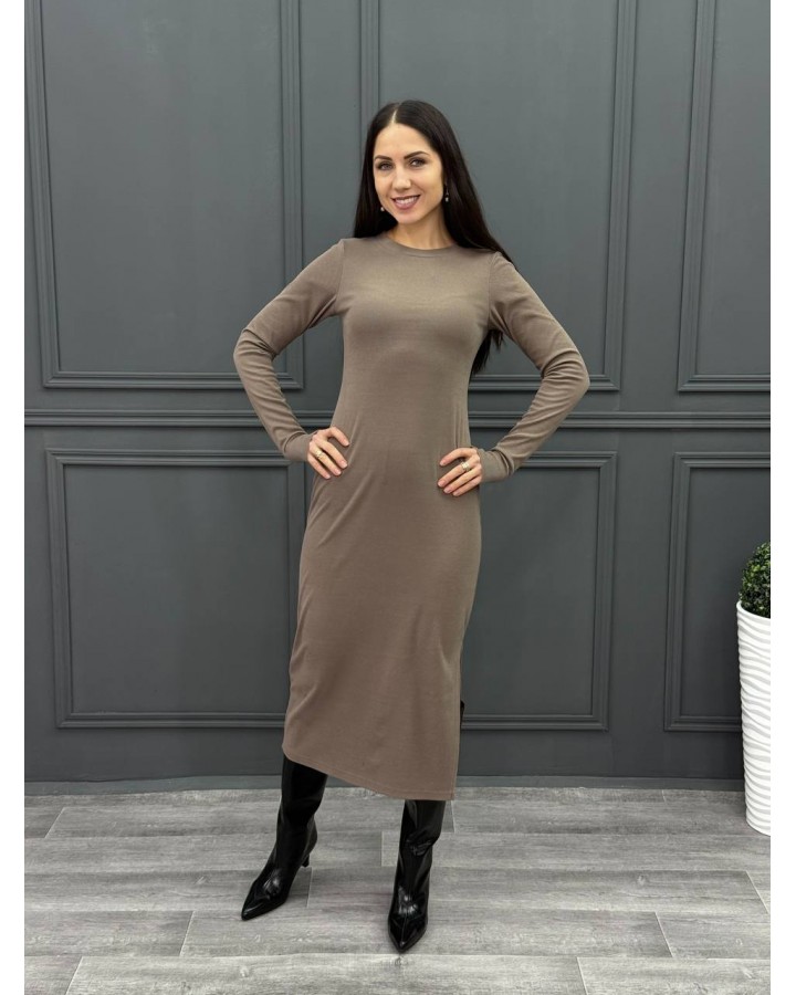 Облегающее платье из трикотажа в рубчик в цвете капучино с разрезом. Маломерит на размер