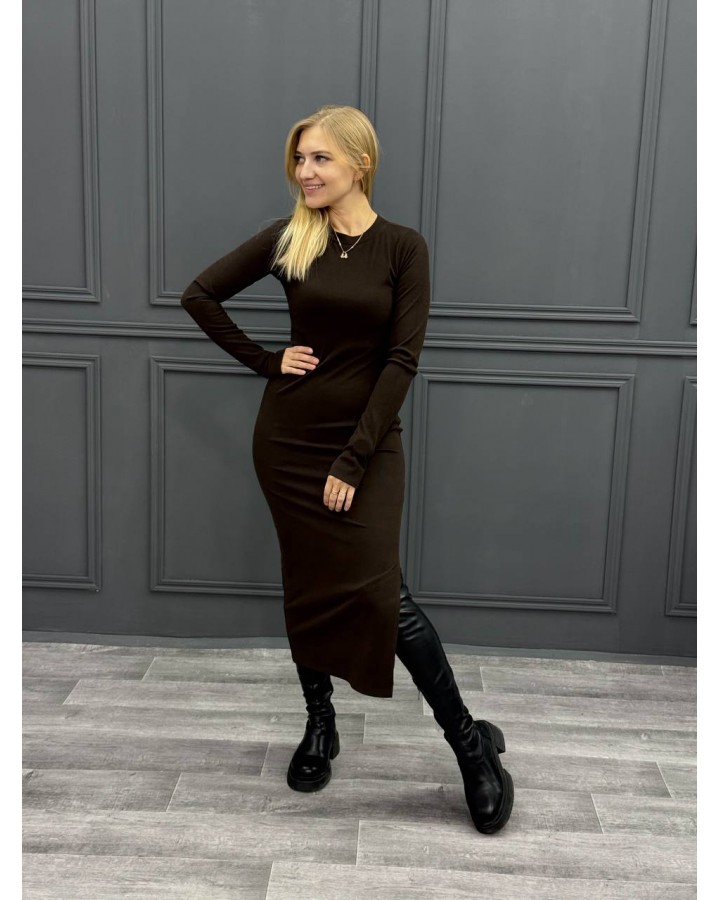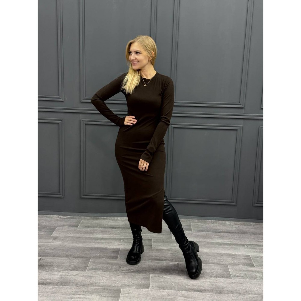 Силуэтное платье из трикотажа в рубчик в шоколадном цвете с разрезом. Маломерит на размер