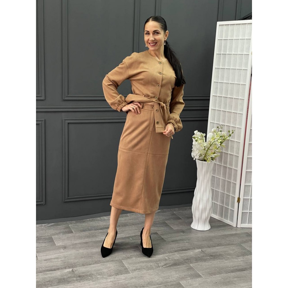 Костюм из замшевого трикотажа. Состоит из юбки в длине миди ( без резинки на поясе) и жакета без подкладки. Съемный пояс в комплекте