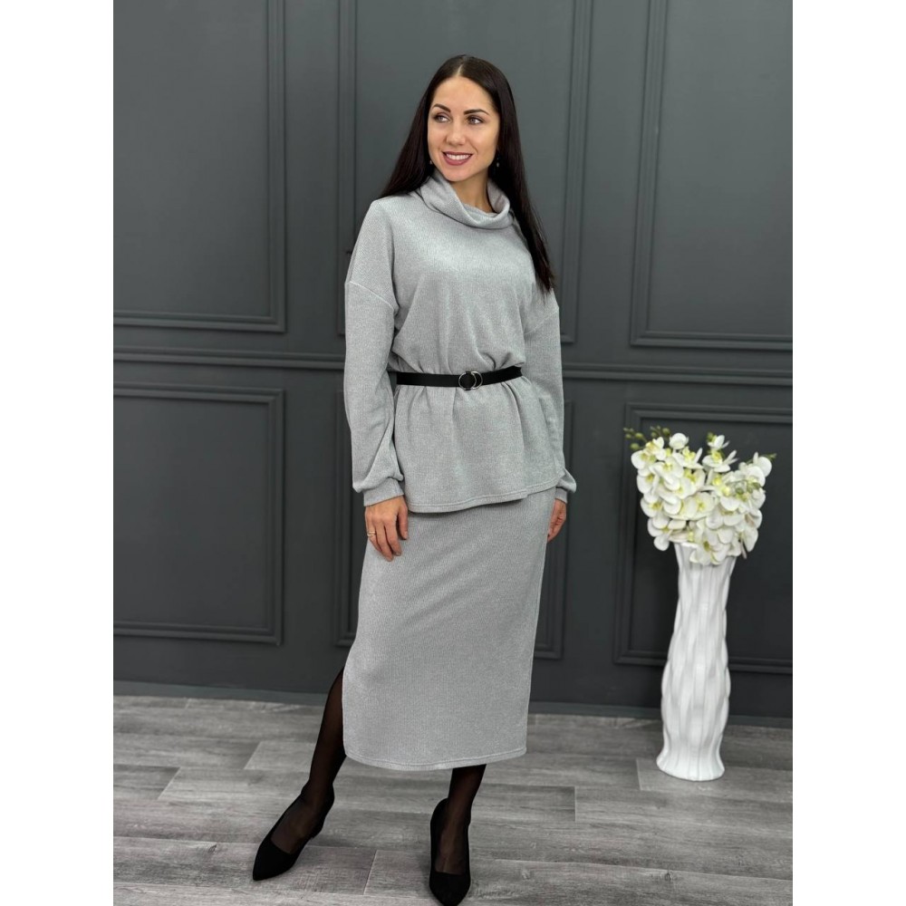 Оформить заказКостюм из вязанного трикотажа. Юбка на резинке в длине миди, свитер свободного кроя с высоким горлом. Пояс в комплекте