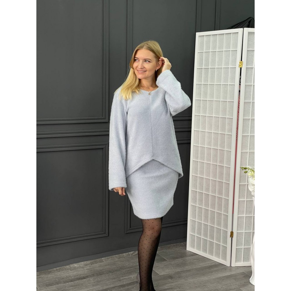 Костюм из трикотажа пушистик в голубом цвете. Свитер с фигурным вырезом по переду, удлиненная спинка. Пояс в комплекте. Трикотажная юбка на резинке.