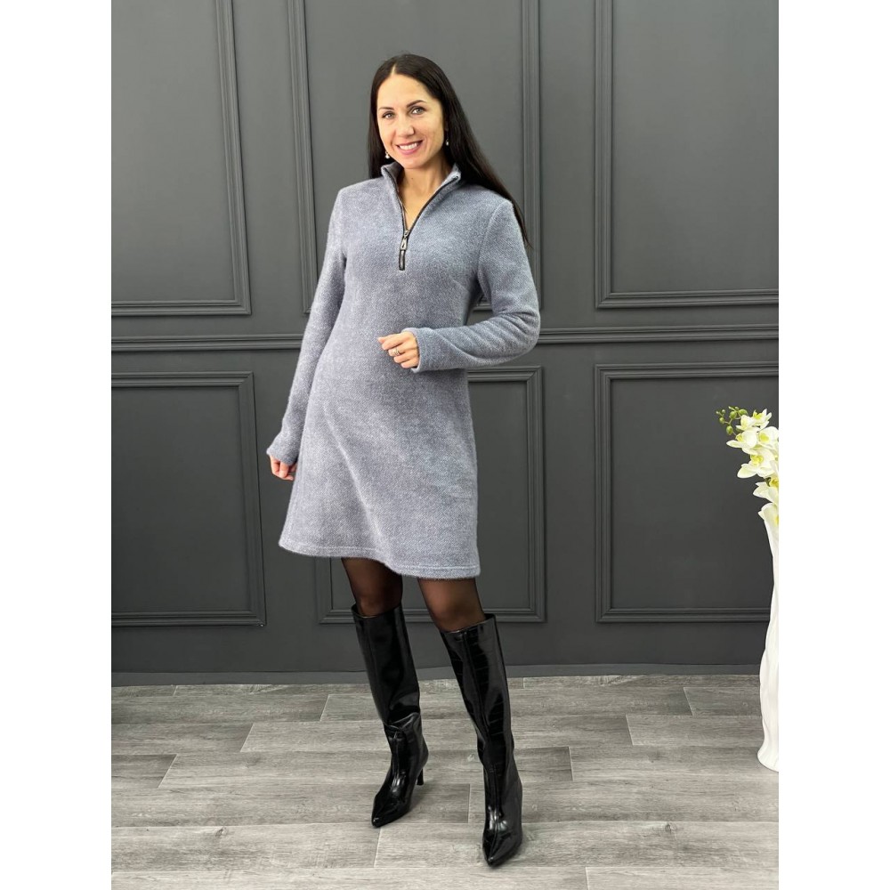Платье из трикотажа пушистик в цвете графит с голубым подтоном. Длина мини, горловина стойка на молнии
